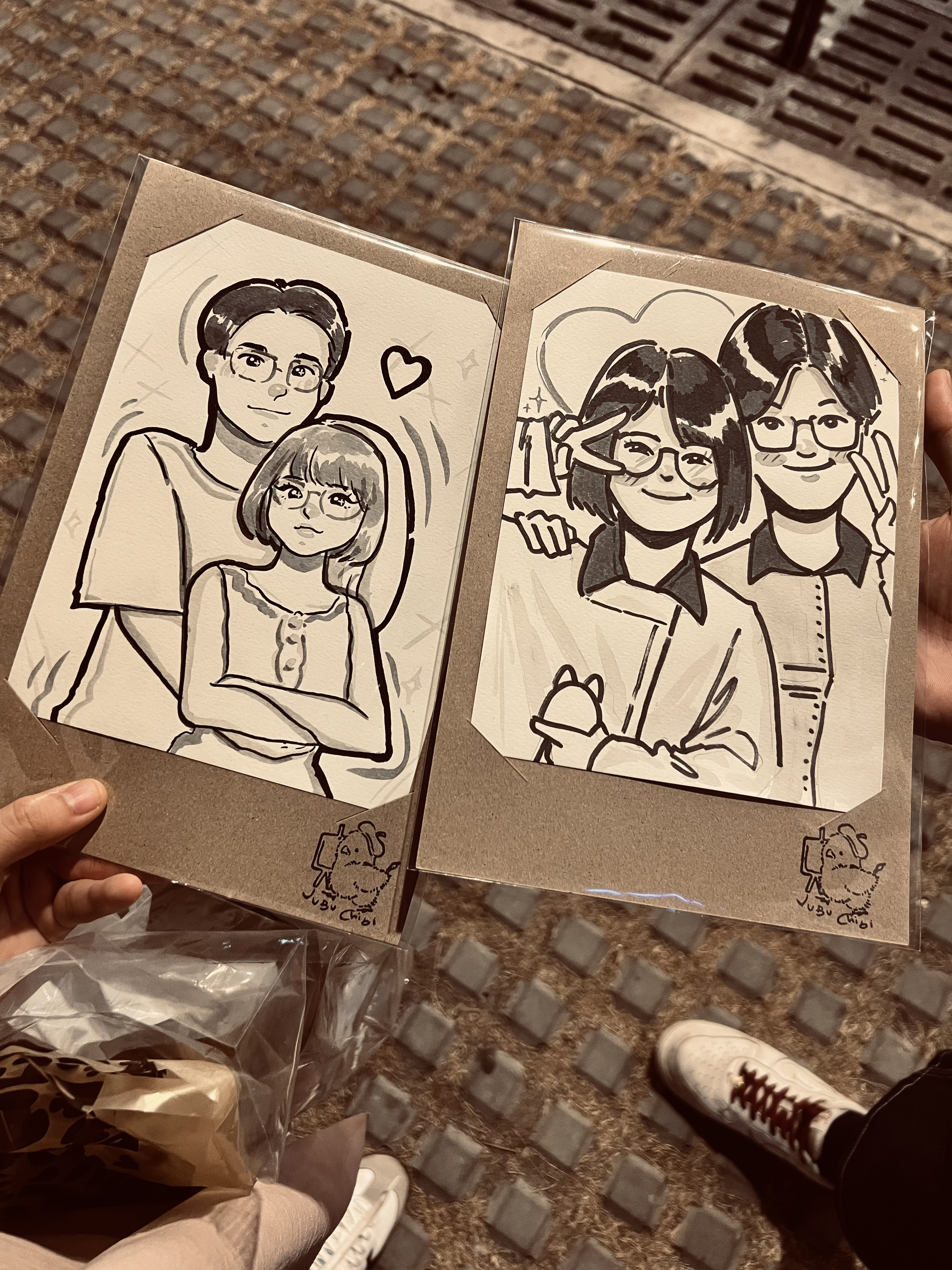 We gave the artist our photo, and watched as we slowly turned into adorable little cartoon characters.